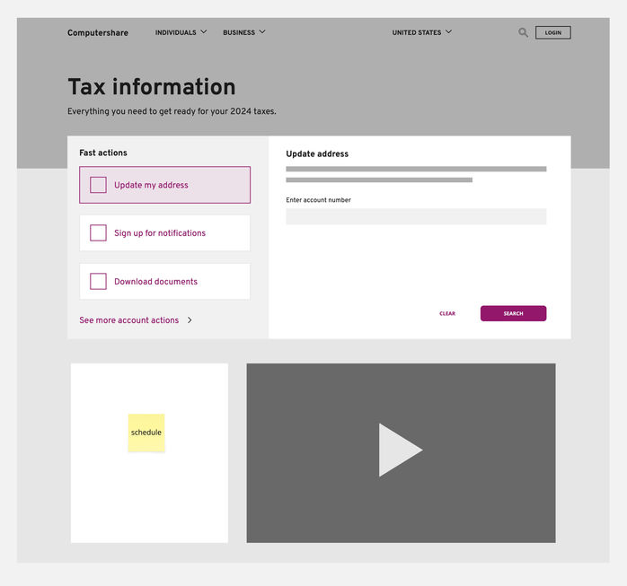 For a basic layout, I took inspiration from other existing Computershare pages that presented actions in individual cards. I kept those and the most important information at the top of the page. The customer relations team was working on creating a "Tax 101" video to include but we weren't sure if it would be done by the time the dashboard would launch so I made two versions to review - one with space for the video and one without.
